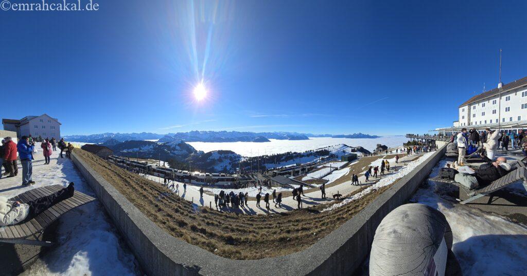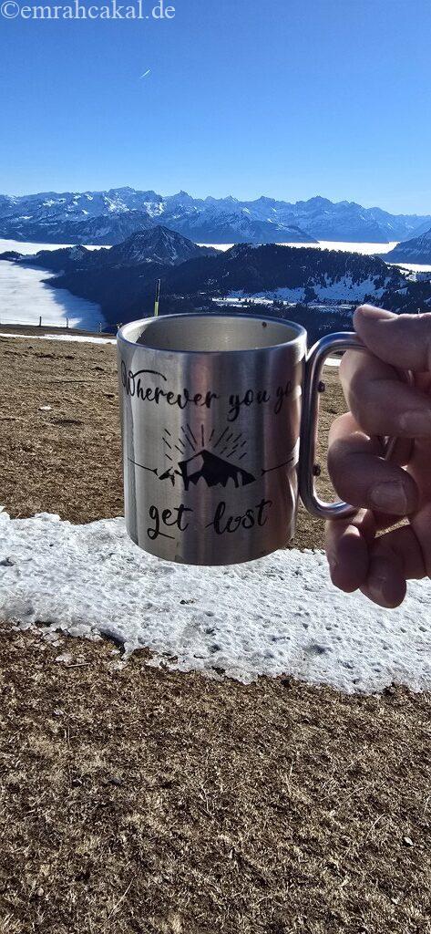 Rigi Kulm zirve noktası istasyonuna vardığımızda ise deniz seviyesinde -3 derece olan hava, yerini +5 derece civarında bir sıcaklığa bırakmıştı. Bu sürprizle birlikte manzaranın keyfini çıkarmaya başladık. Tabii ki termosum ve sıcak kahvem de bu anlarda bana eşlik etti.