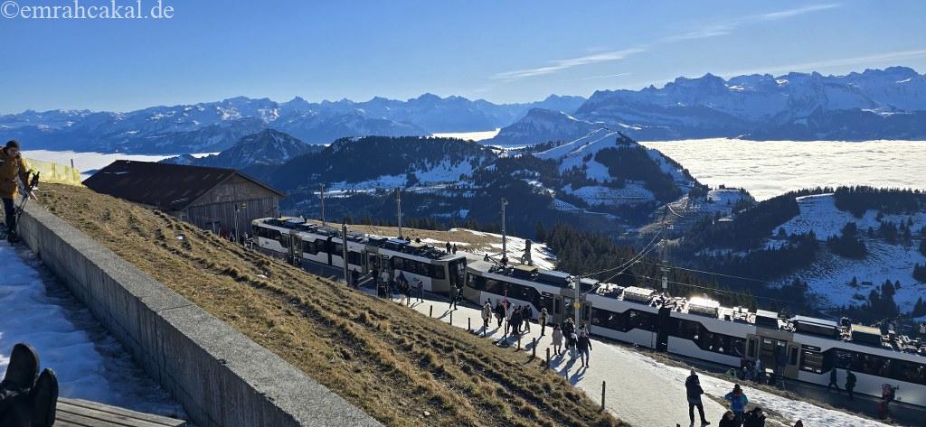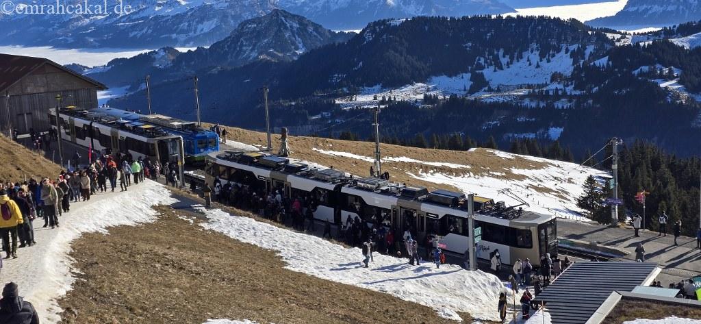 Rigi Kaltbad’daki tren istasyonunda, Vitznau’dan kalkan dağ trenine aktarma yaparak hedefimiz olan 1797 metre yükseklikteki Rigi Kulm noktasına doğru yolculuğumuza devam ettik.
