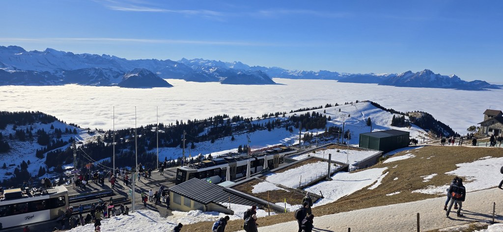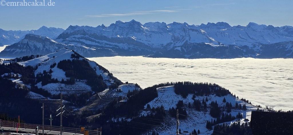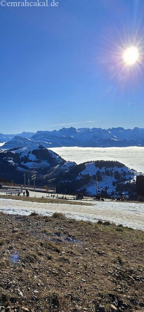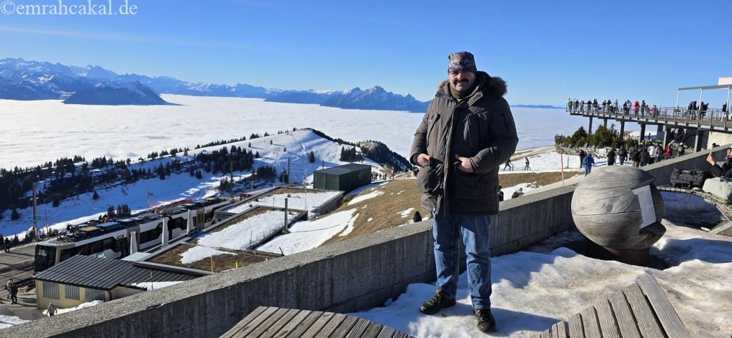 Rigi Kulm zirve noktası istasyonuna vardığımızda ise deniz seviyesinde -3 derece olan hava, yerini +5 derece civarında bir sıcaklığa bırakmıştı. Bu sürprizle birlikte manzaranın keyfini çıkarmaya başladık. Tabii ki termosum ve sıcak kahvem de bu anlarda bana eşlik etti.
