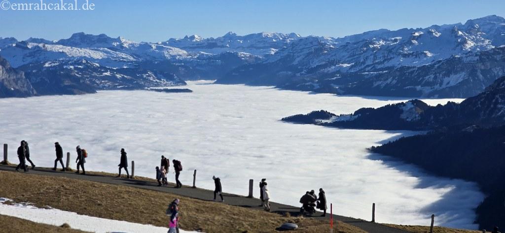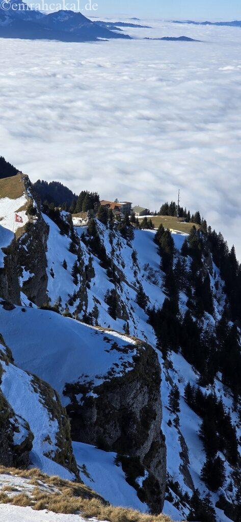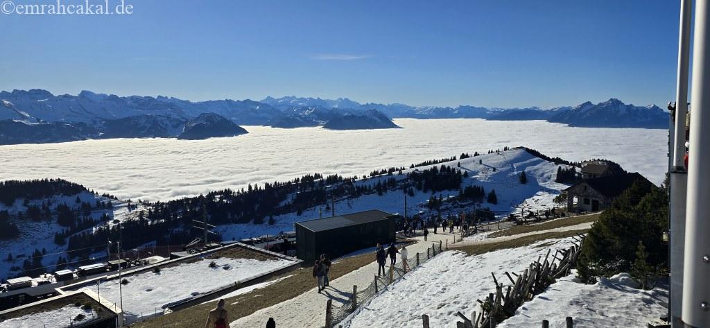 Weggis’ten bindiğimiz gondol teleferikle yolculuk ederken, yaz aylarında yaşamadığımız bambaşka bir deneyim yaşadık. Hava bulutlu ve kapalıydı; bu da olduğundan daha soğuk hissettiriyordu. Ancak gondol teleferikle bulutların üzerine çıktığımızda, adeta başka bir dünyaya ulaşmış gibiydik.